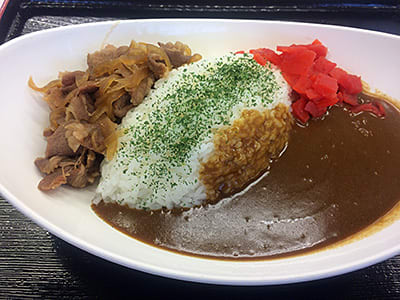 ノーマルのカレーライスとは違って、ライスを山城に見立てているらしい。だから山城ライスをカレーから攻めても良し、かなり甘めの牛肉から攻めても良しとのこと。なるほど、牛丼&カレーライスの合わせ技って感じだ。思いっきり想像できる味だが、この組み合わせは少なくとも男性陣にとっては悪くはない。