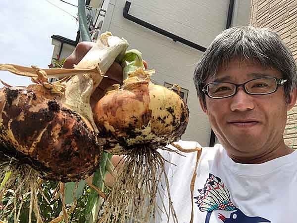 早速、ドキドキしながら思いっきり力を入れて玉ねぎちゃんを引っこ抜く。おぉ〜このバリバリという音と抵抗感が心地よいのだ。もちろん、ワクワクドキドキ!おぉ〜いいサイズじゃない?期待通りだ。このサイズじゃないとねぇ〜。嬉しい!うん、それもいいサイズで計6個収穫完了。