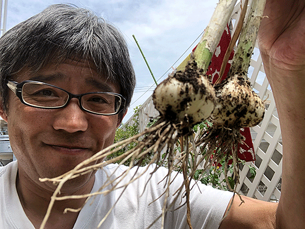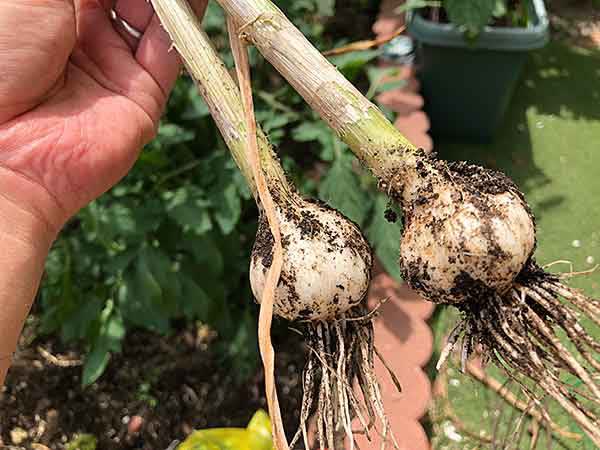 更に勢いに乗ってニンニクも収穫。まずは、我が家のミニ畑のニンニクを収穫。あれっ?手応えがえらく軽いけど・・・おいおい、小ちゃい〜?まるでラッキョウみたい?諦めずに鉢のもの、バラの株元に植えたものを躊躇せずに収穫するが、何でだぁ〜全部失敗作?香りは思いっきりあのニンニク臭・・・く、く、臭い。とりあえず、小さいが使えることはできるだろう。とりあえず収穫完了ということで。