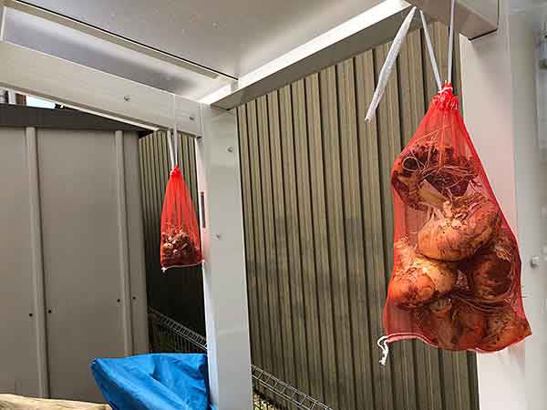 玉ねぎとニンニクを各々収納袋に収納し、サイクルポート下にて乾燥保管だ。うん、こういう時にサイクルポートは便利。思い切って導入して正解だった。まぁ〜素人の家庭菜園は成功や失敗色々あるものだ。失敗も楽しい経験と前向きにとらえよう。来年絶対リベンジしてやる!