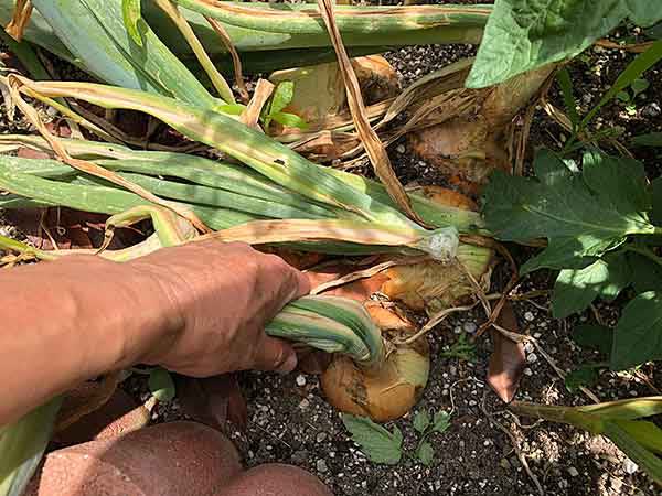 今日はもう〜収穫してしまってもいいだろうっとタマネギを収穫だ。GWに「玉ねぎ村」の8個はすでに収穫し終えたが、どうも小さめ。今日のは地植えものだ期待していいだろう?
