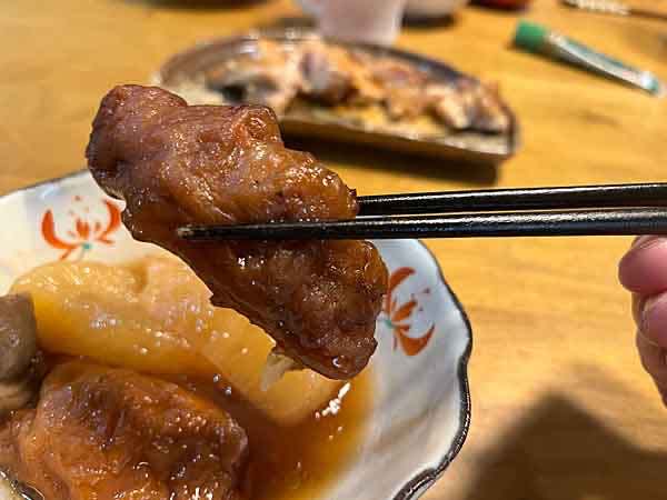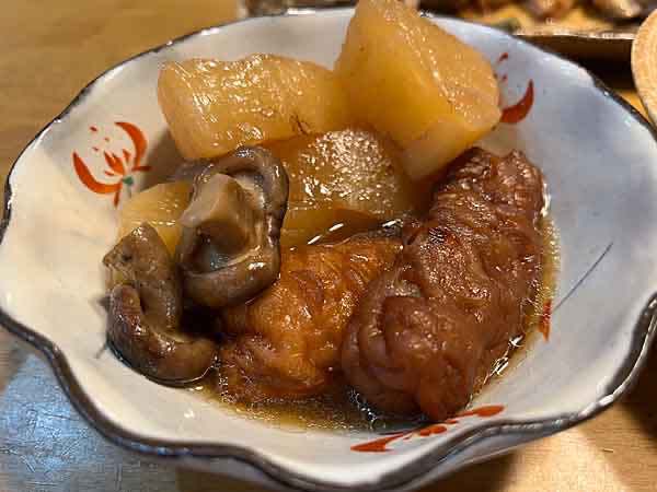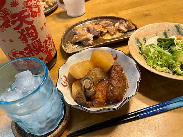 早速、晩飯だ。今宵のアテは煮物だ。おぉ〜煮込んださつま揚げって美味いねぇ〜。「開墾畑の天狗櫻」がぐんぐん進むよ。