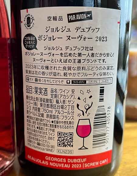 我々バブル世代にとって一大ブームを巻き起こした時のワインって言っていいのかな?80年代後半だよね。世界で1番最初の解禁日を迎えると言うことで、大ブレークとなり、当時はボジョレー品切れ続出で探しまわった程だ。若き頃幾つも買い求めてはユーザーの配りまくってえらく喜んでもらった記憶がある。懐かしいなぁ〜。