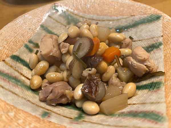 晩飯はおぉ〜焼酎にも合うねぇ〜サラミと生ハム!クリスマスで食った残りだね。そして豆の煮物、更にメインは豚肉のみぞれかけだ。